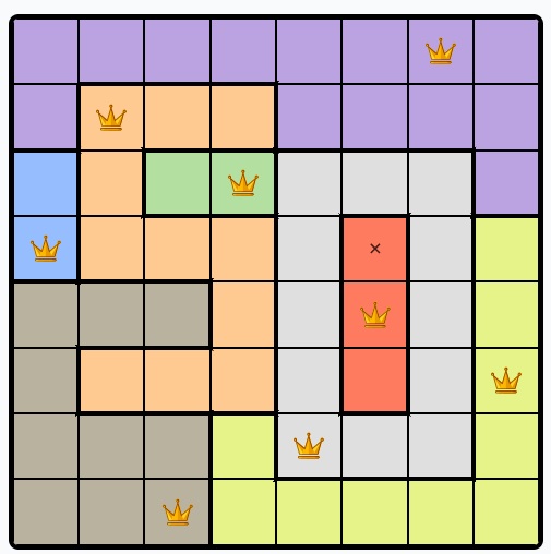 Row 1, Purple Region: A crown is already placed at the far left. This blocks the rest of Row 1, Column 1, and diagonals around it.
