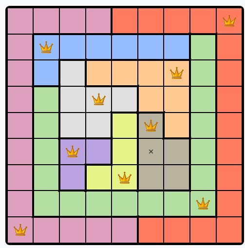 The grid is divided into distinct colored regions. Once you place a crown in one square of a region, you can mark the rest of that region as blocked.